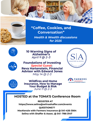 Coffee, Cookies and Conversation Hosted by Shaffer & Associates and Farmer's Insurance! Today's topic is Wildfires and Home Insurance, How to Manage Your Budget & Risk.